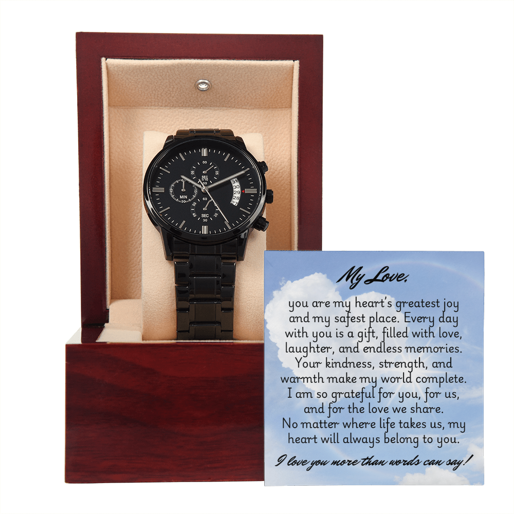 This Black Chronograph Watch can withstand constant use and it's a versatile piece sure to warm hearts and create smiles. Featuring a three-dial face, calendar function, and luxury pointer in a water-resistant and scratch-proof vessel. Made from high-quality Stainless Steel and featuring a Copper Dial.