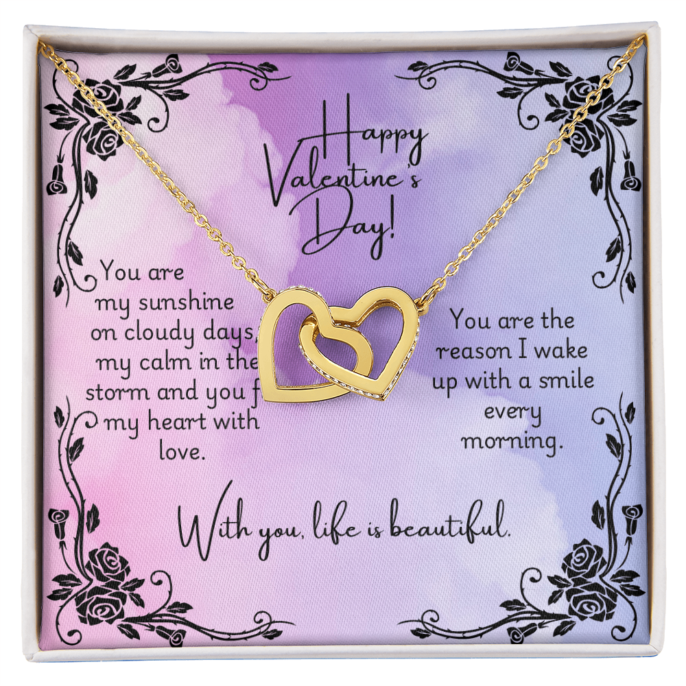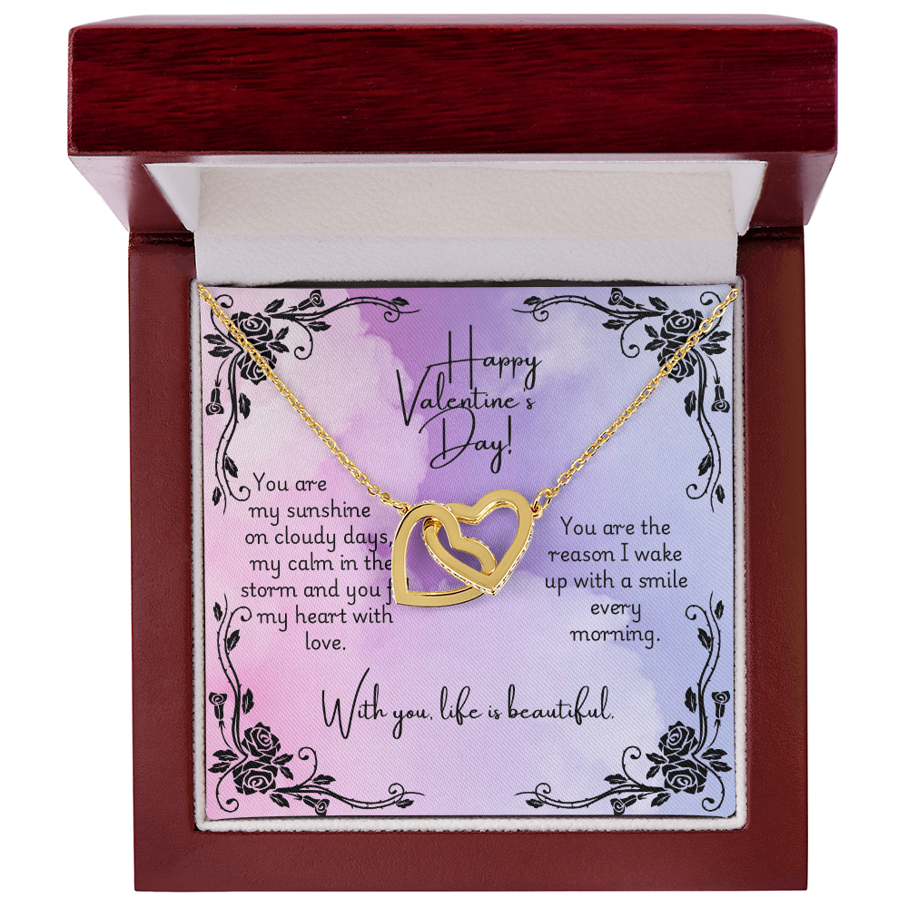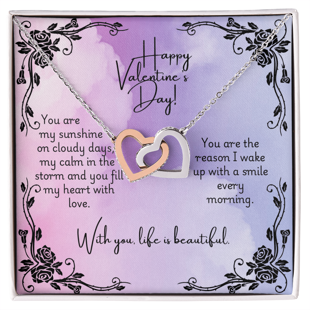 These interlocked hearts, a timeless symbol of an unbreakable bond and enduring love between two souls, features two lovely hearts embellished with cubic zirconia crystals. This necklace is the perfect accessory for everyday wear.