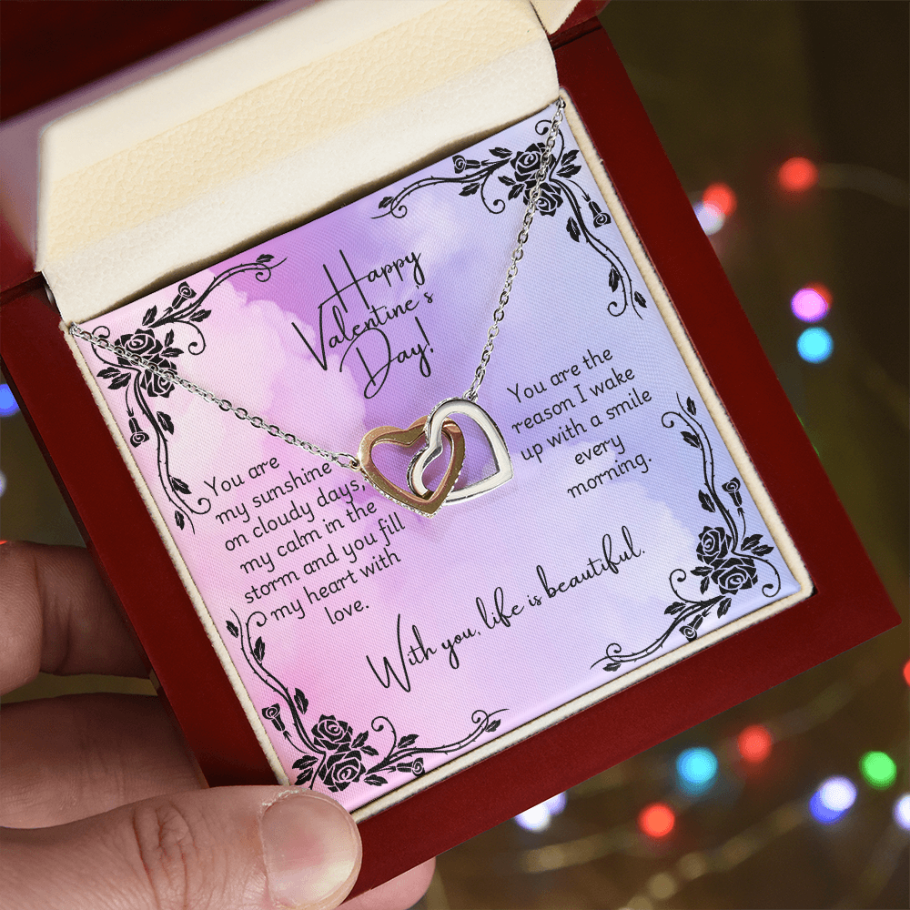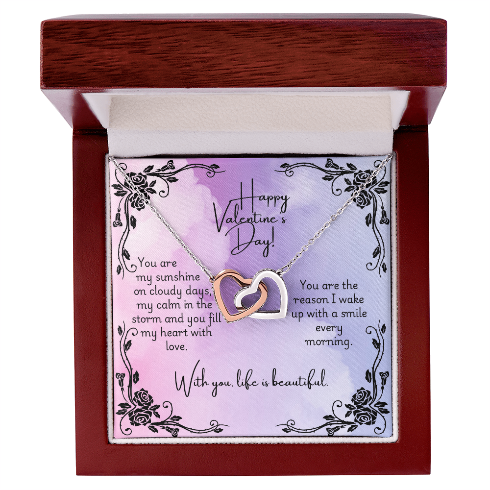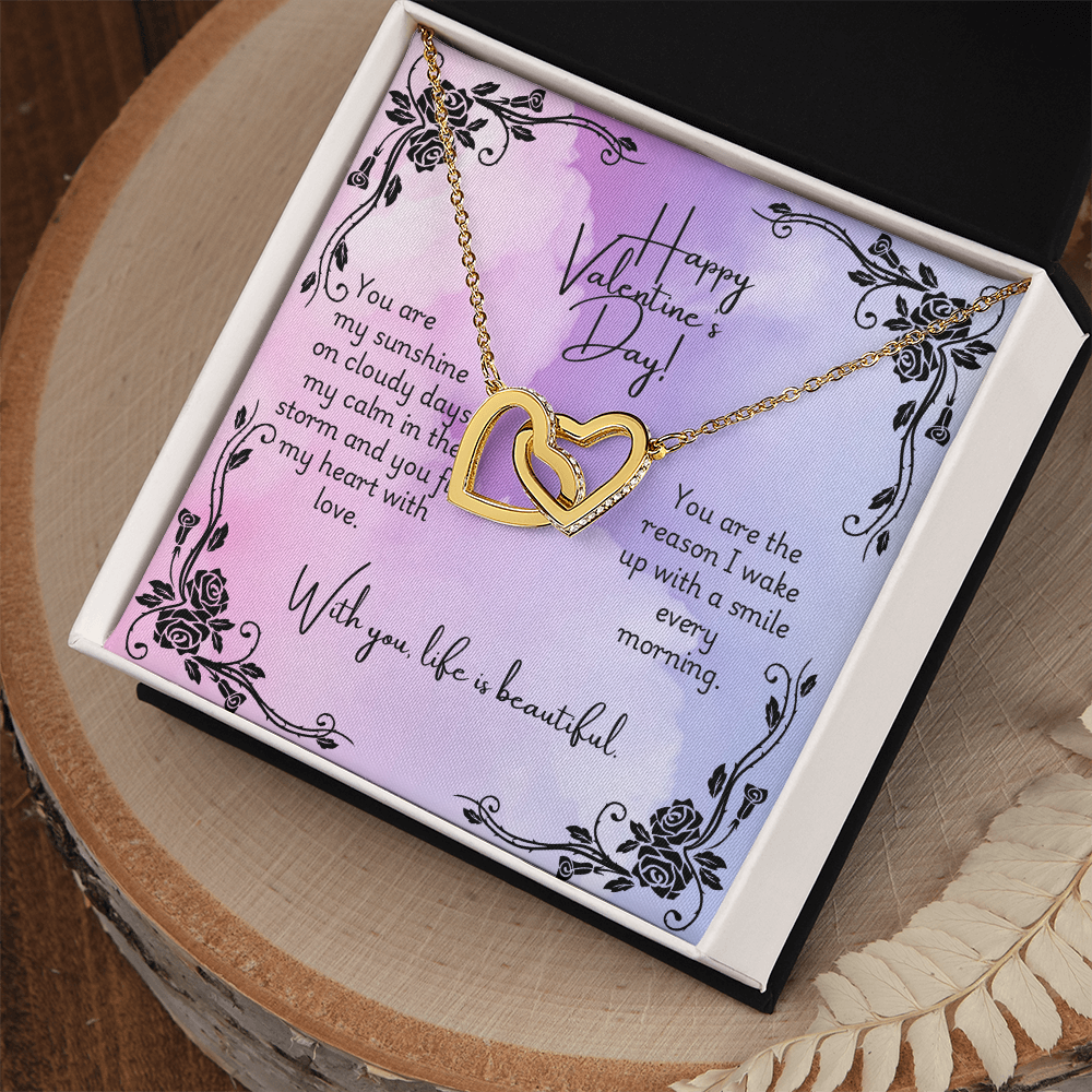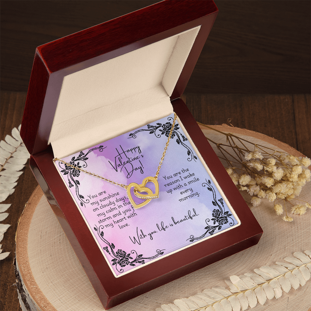 These interlocked hearts, a timeless symbol of an unbreakable bond and enduring love between two souls, features two lovely hearts embellished with cubic zirconia crystals. This necklace is the perfect accessory for everyday wear.