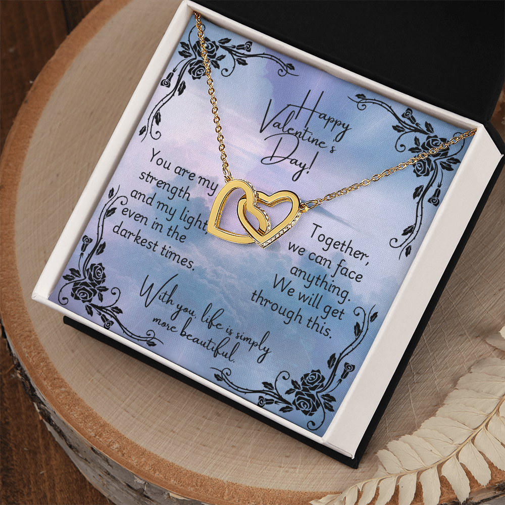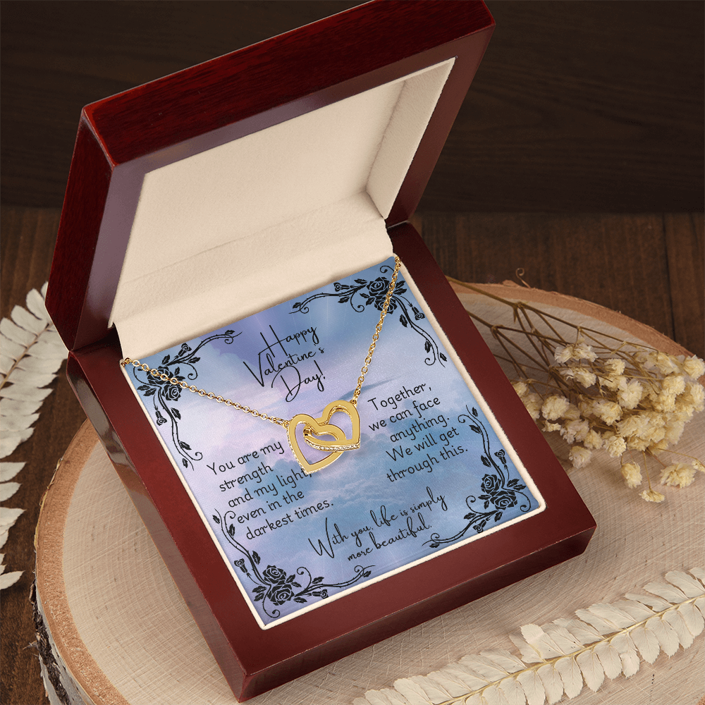 These interlocked hearts, a timeless symbol of an unbreakable bond and enduring love between two souls, features two lovely hearts embellished with cubic zirconia crystals. This necklace is the perfect accessory for everyday wear.