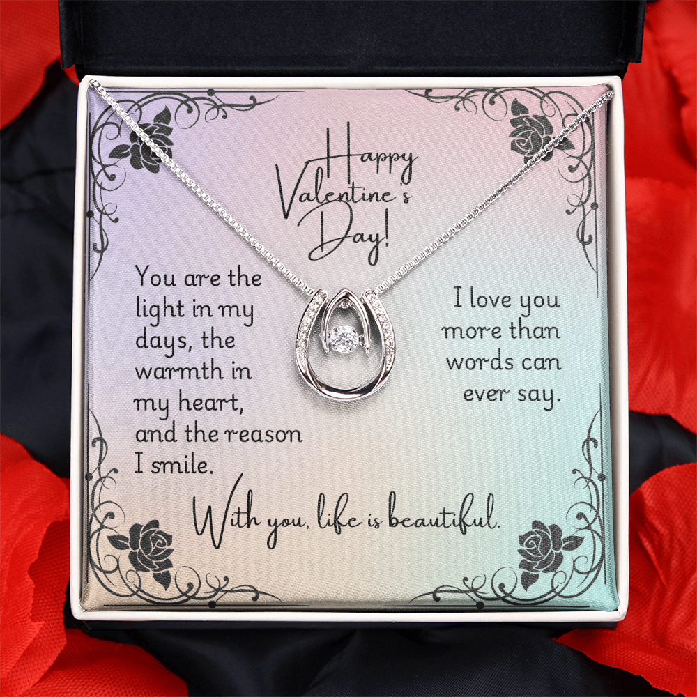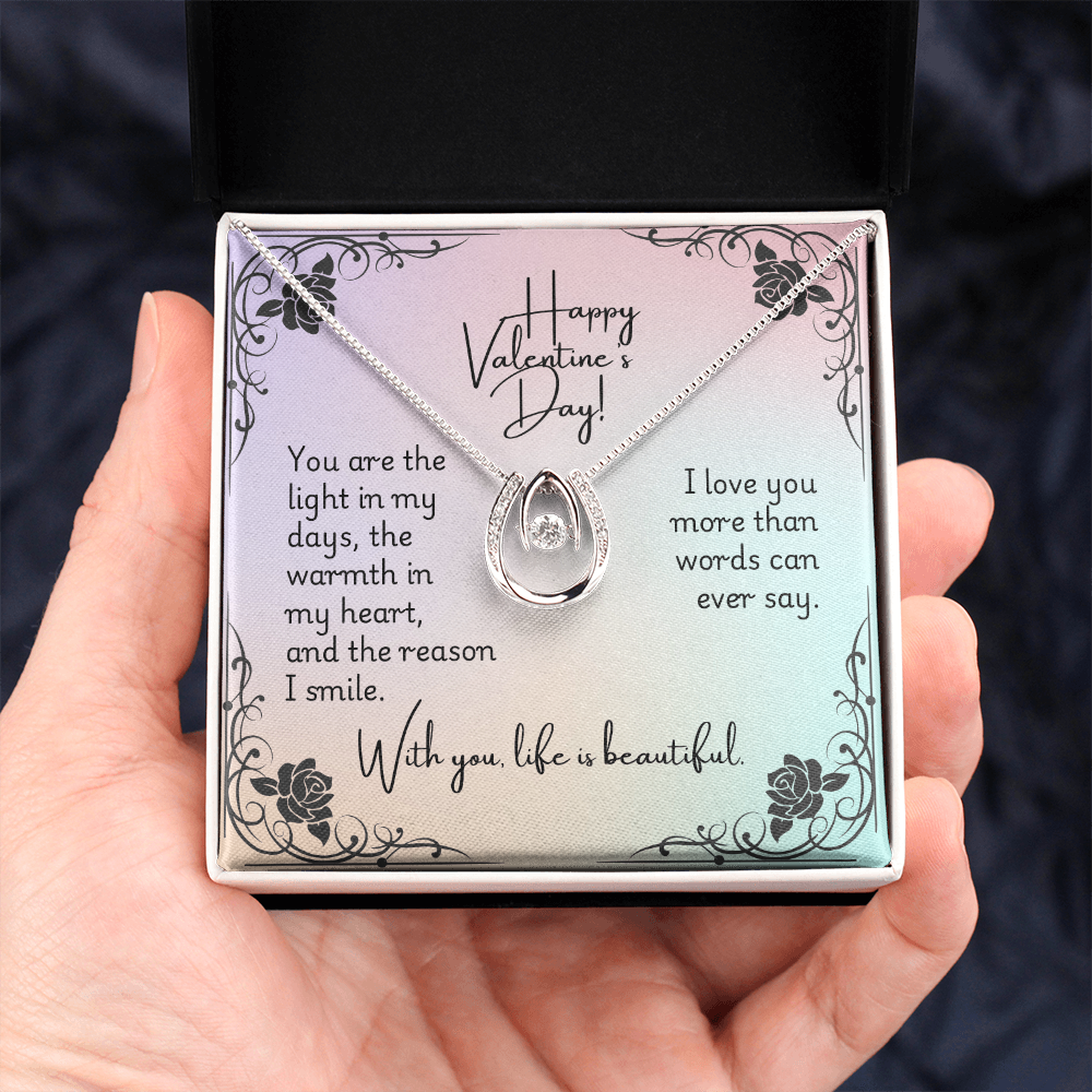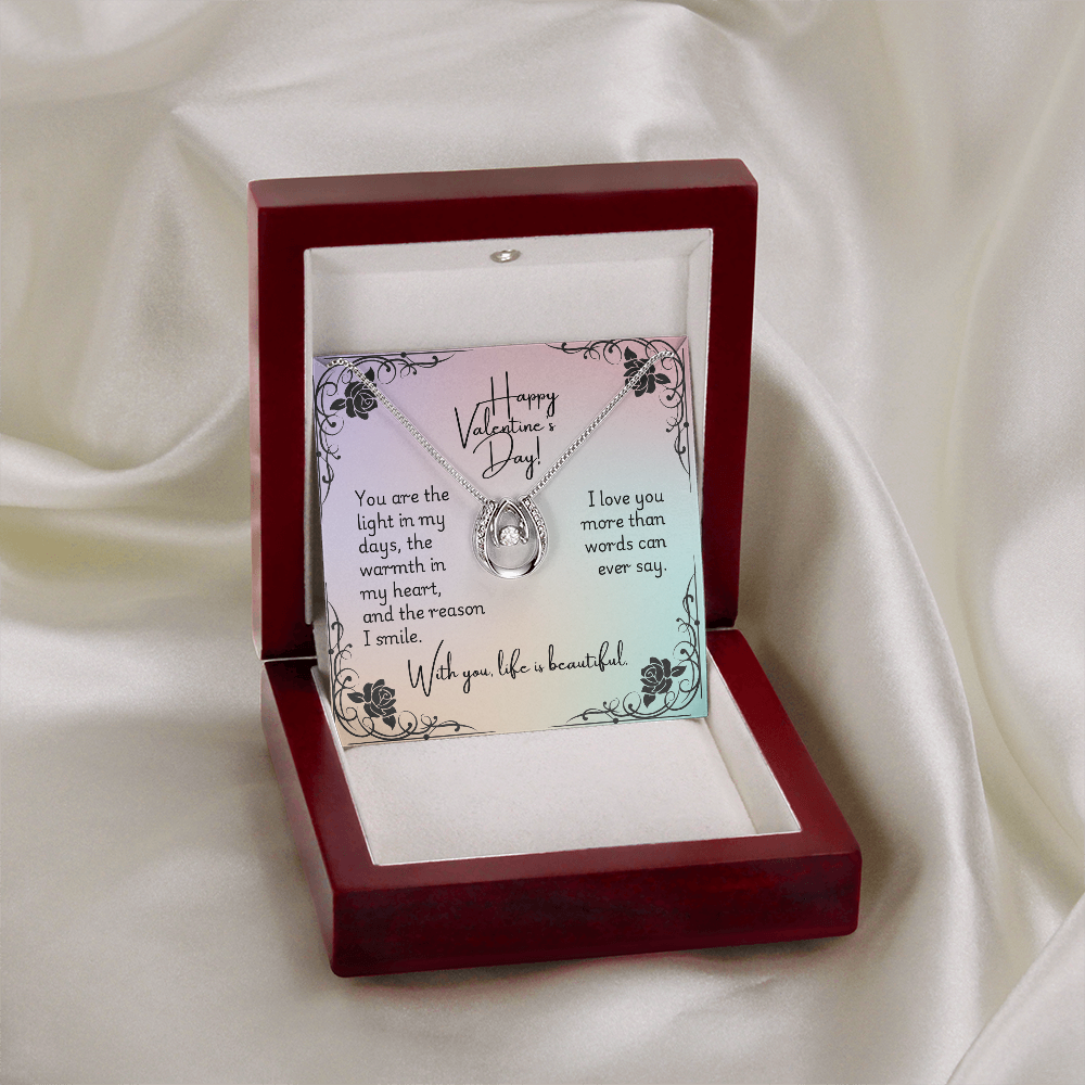 This Lucky In Love Necklace shows how lucky you are to have that special someone in your life. Hand crafted details make this necklace a stand out. This versatile necklace is dipped in white gold and set with shimmering crystals. A dancing center Cubic Zirconia is suspended from two fine points and is designed so as to not touch the skin but continually move in a vibrating fashion.