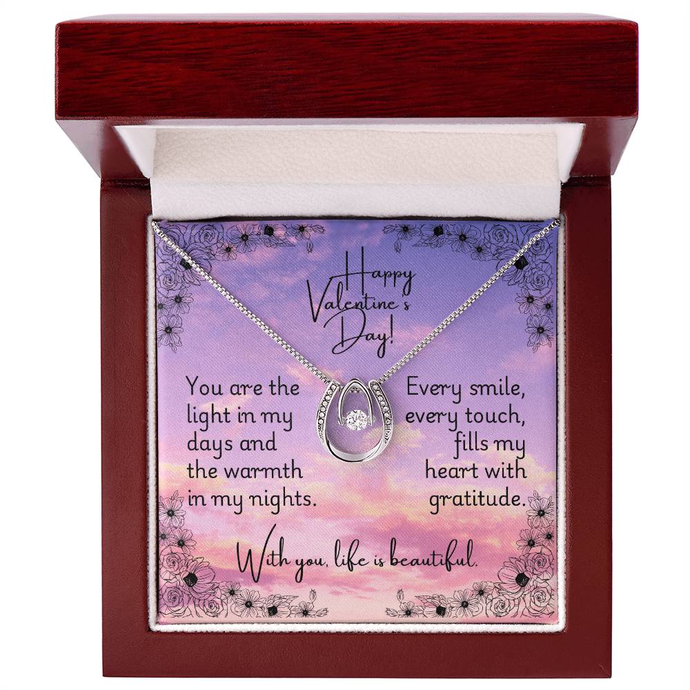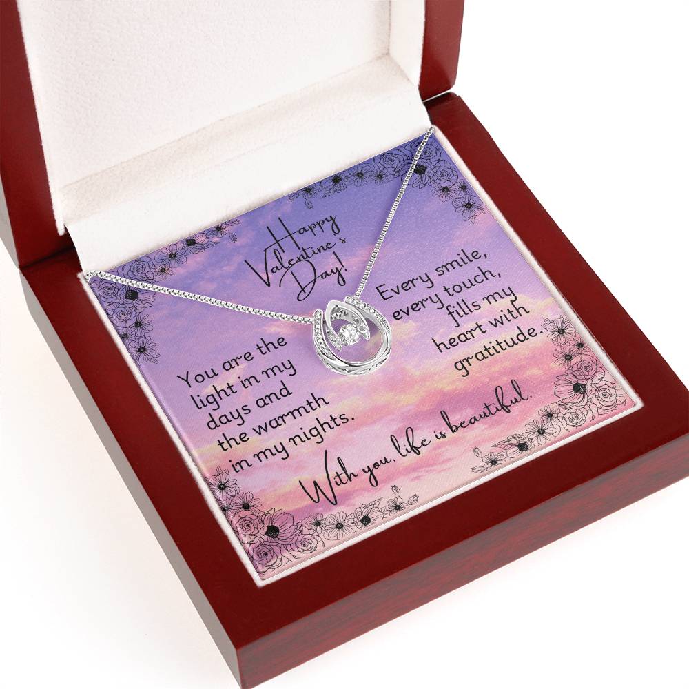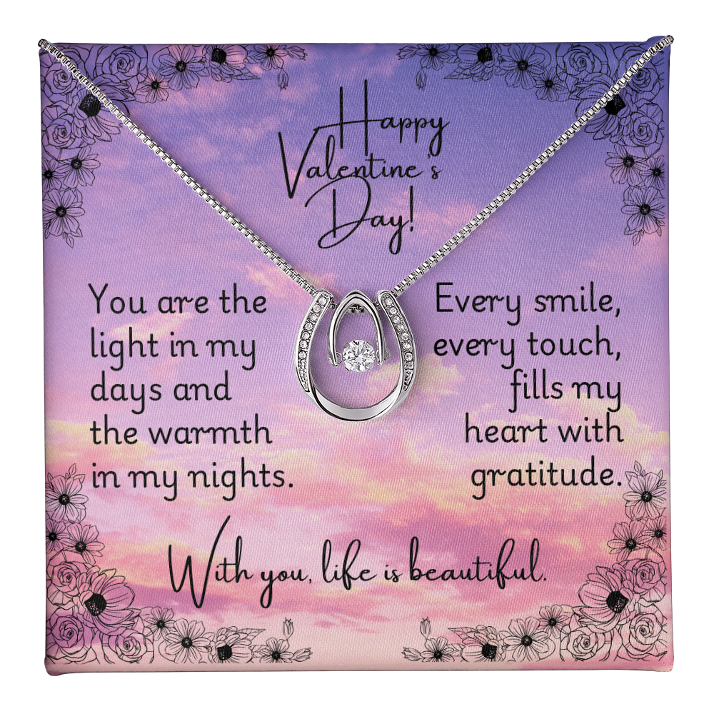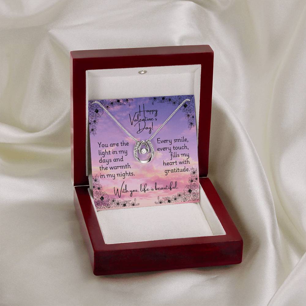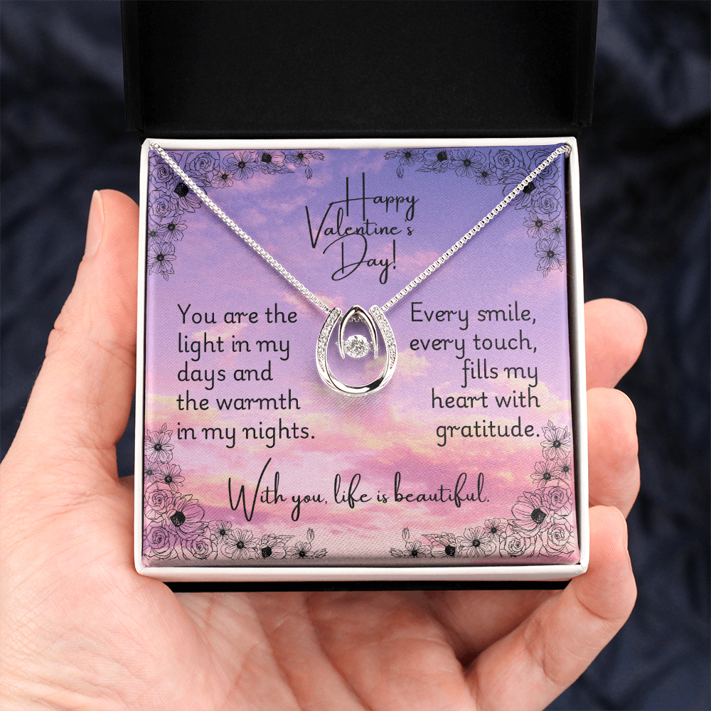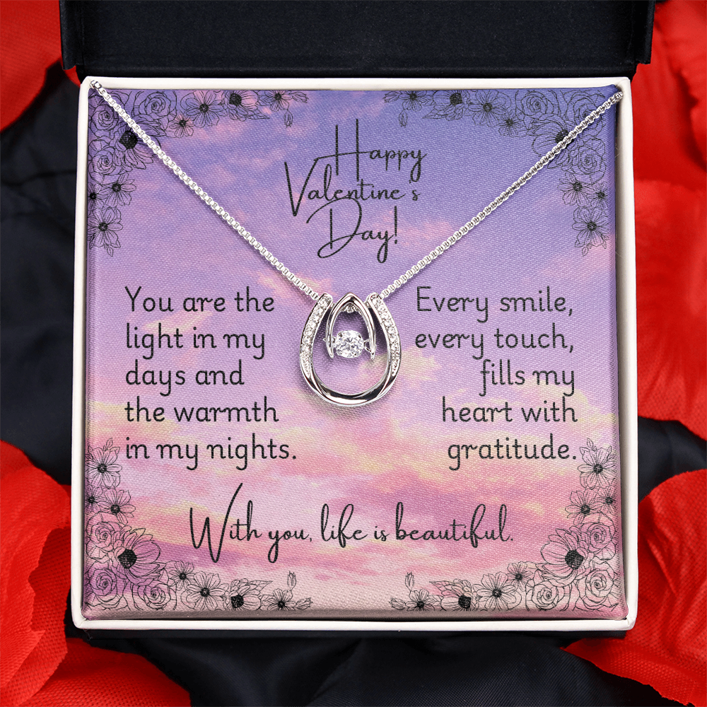 This Lucky In Love Necklace shows how lucky you are to have that special someone in your life. Hand crafted details make this necklace a stand out. This versatile necklace is dipped in white gold and set with shimmering crystals. A dancing center Cubic Zirconia is suspended from two fine points and is designed so as to not touch the skin but continually move in a vibrating fashion.