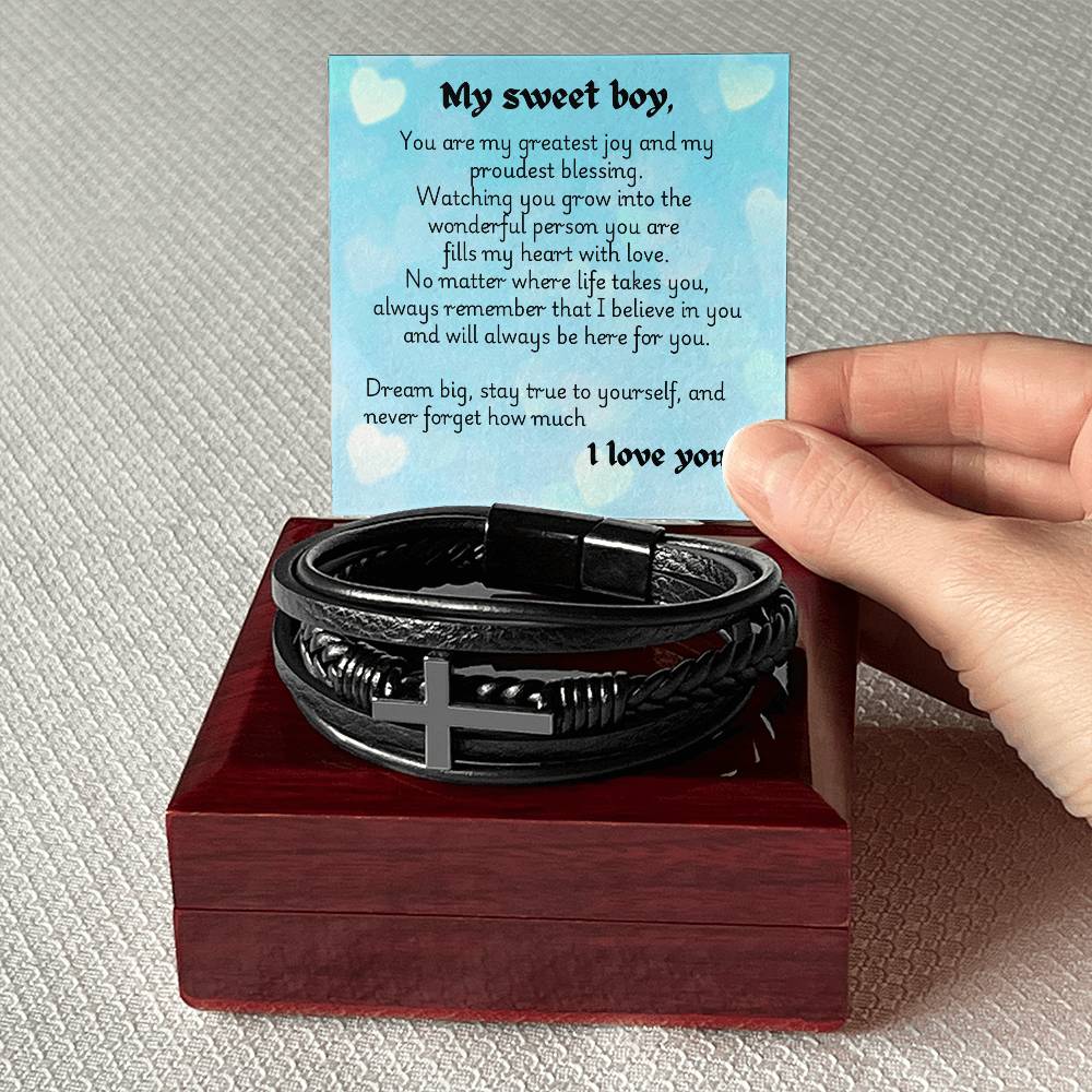 This Men's Cross Leather Bracelet is the perfect keepsake for someone special in your life. Handcrafted with care, this piece features braided vegan leather and a sleek stainless steel cross. This would make an ideal gift for your loved one on special occasions like anniversaries, birthdays, or any event where you want to express your love and appreciation in an unforgettable way.